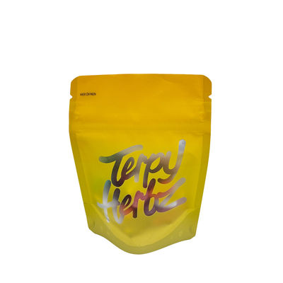 در مورد طراحی سفارشی رنگ زرد متراکم یک طرف فولیک یک طرف شفاف 3.5 گرم کیسه های علف های بلند با زیپ ضد بچه